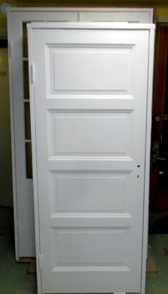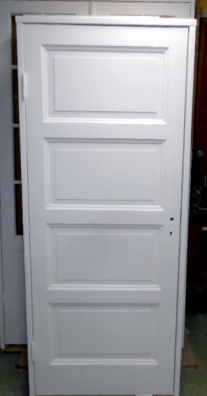 spegeldörr med 4-speglar som är RENOVERAD & MÅLAD (se bild) - - (Dörrbladsmått: B: 77 cm x H: 204 cm) - - ovanligt fina markerade profileringar - - nybyggd karm i vinterfälld fura med "antika"/tidstypiska gångjärn - - Lagerplats: m. b.