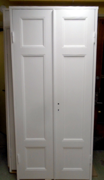renoverad och målad spegelpardörr/dubbeldörr med 3-speglar i varje dörr - - dörrbladsmått: ( B: 93.5 cm x H: 212 cm) - - karm nytillverkad i vinterfälld fura med antika/tidstypiska beslag - - installationsklar - - höger dörr aktiv ( se bild) - - Lagerplats: b.