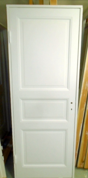 RENOVERAD och MÅLAD spegeldörr: tre speglar (upphöjda) - - med "antika"/tidstypiska gångjärn - - (mått på dörrbladet B: 73 cm x H: 204,5 cm) - - - - karm nybyggd i vinterfälld fura - - - - INSTALLATIONSKLAR - - Lagerplats: m.4b