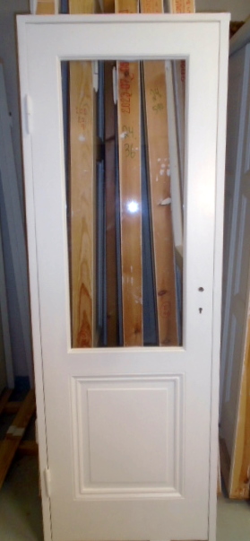 RENOVERAD & MÅLAD spegeldörr med glasöppning - - Dörrbladsmått: (B: 63,5 cm x H: 194 cm) - - NYBYGGD karm i vinterfälld fura med "antika" lyftgångjärn - - glasmått B: 44 x H: 103,5 cm - - INSTALLATIONSKLAR - - Lagerplats: L.