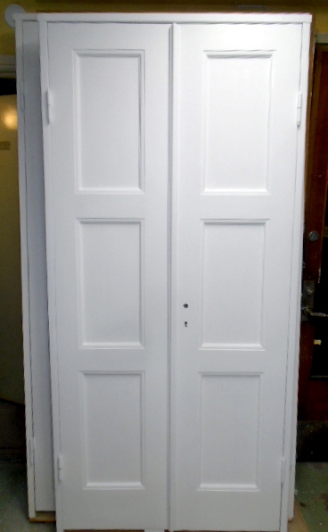 renoverad och målad spegelpardörr/dubbeldörr med 3-speglar i varje dörr - - dörrbladsmått: ( B: 96 cm x H: 211 cm) - - karm nytillverkad i vinterfälld fura med antika/tidstypiska beslag - - installationsklar - - höger dörr aktiv ( se bild) - - Lagerplats: b.
