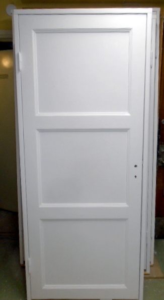 RENOVERAD och målad spegeldörr med 3-speglar (släta) - - dörrbladsmått: (B: 83 cm x H: 204,5 cm) - - Karm nybyggd i kvistfri fura med "antika" tidstypiska beslag (se bild) - - INSTALLATIONSKLAR - - profil: typ "svanhals" - - Lagerplats: m.1 28
