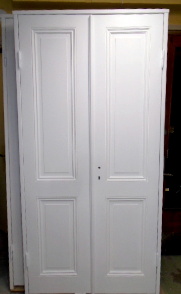 RENOVERAD & MÅLAD spegelpardörr / dubbeldörr med 2-speglar i varje dörr och med sekelskiftsprofileringar (halvfranska) - - Dörrbladsmått: (B: 102,5cm x H: 214,5 cm) - - karmen är nybyggd i vinterfälld fura med "antika"/tidstypiska gångjärn - - - - installationsklar - - högerdörr aktiv (se bild) - - - - Lagerplats: finns i Bromma butiken