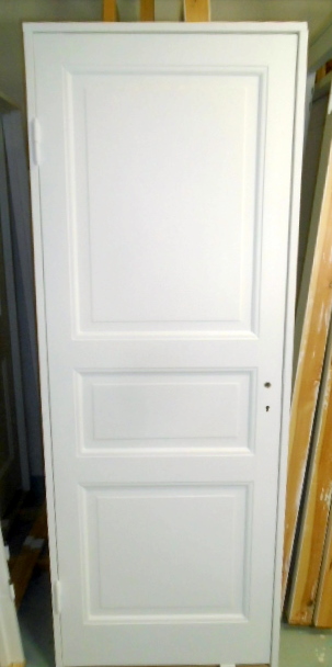 RENOVERAD och MÅLAD spegeldörr: tre speglar (upphöjda) - - med "antika"/tidstypiska gångjärn - - (mått på dörrbladet B: 73 cm x H: 204,5 cm) - - - - karm nybyggd i vinterfälld fura - - - - INSTALLATIONSKLAR - - Lagerplats: m.4b