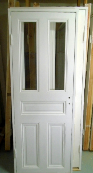 RENOVERAD spegeldörr med glasrutor - - Dörrbladsmått: (B: 73,5 cm x H: 205 cm) - - nybyggd karm i vinterfälld fura med antika/tidstypiska beslag - - (MÅLAD samt INSTALLATIONSKLAR) - - glasmått : 18 x 80 cm - - Lagerplats: L.